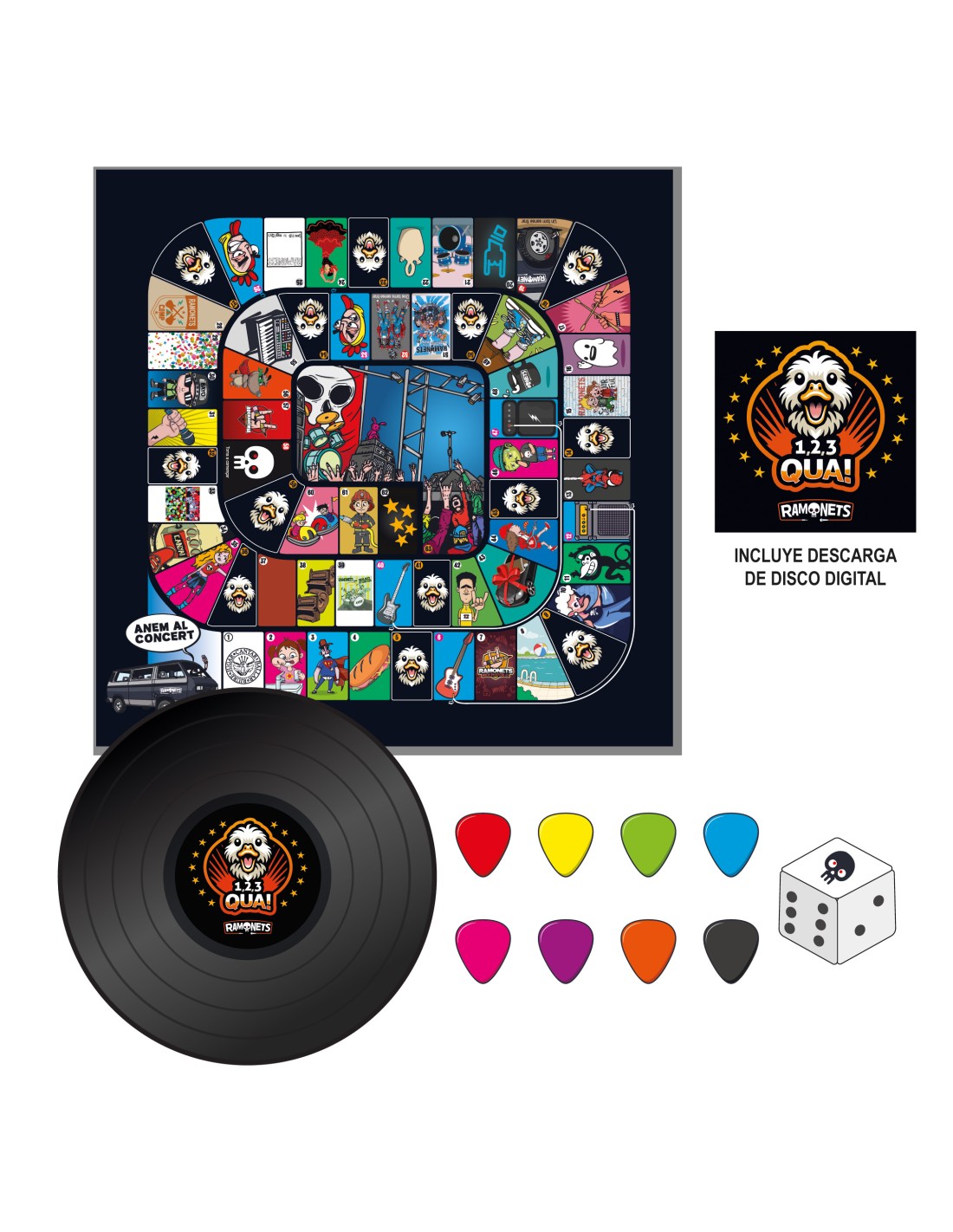 • “Juego de la OCA” con ilustraciones personalizadas que hacen referencia a la historia de RAMONETES. Los/as jugadores/as deben salir desde el local de ensayo, donde se carga la furgo y avanzar por las casillas hasta llegar hasta el escenario donde debe realizarse el concierto. A lo largo del recorrido pueden encontrarse casillas que pueden hacer que se retrasen (un pinchazo, unos cantajuegos zombies que les secuestran, un animador disfrazado de pollo que les hace retroceder…) y casillas que les ayudan a avanzar el pato de la portada (de pato a pato, guitarras que llevan a amplis, etc…). El juego simula ser la carpeta de un vinilo (pero sin vinilo), y dentro lleva unas fichas y un dado recortables.